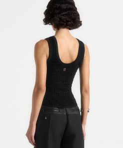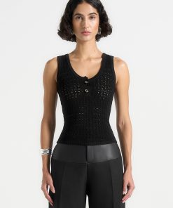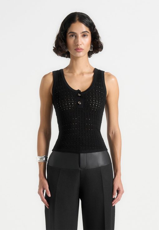 A refined essential, this tank top is crafted from breathable pointelle knit with a flattering v-neckline. Finished with subtle ribbed trims and silver knot feature buttons, it balances softness with striking detail.