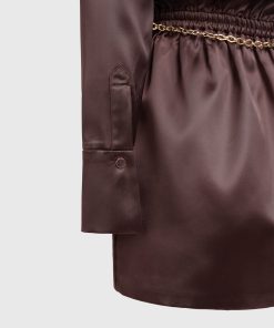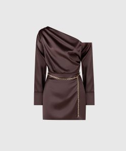 Elevate your wardrobe with our Off Shoulder Draped Satin Mini Dress with Belt. Featuring drape detailing and an asymmetric neckline, this dress exudes sophistication and style. Complete the look with the included chain belt for a flattering fit. Expertly crafted for a polished, modern look.