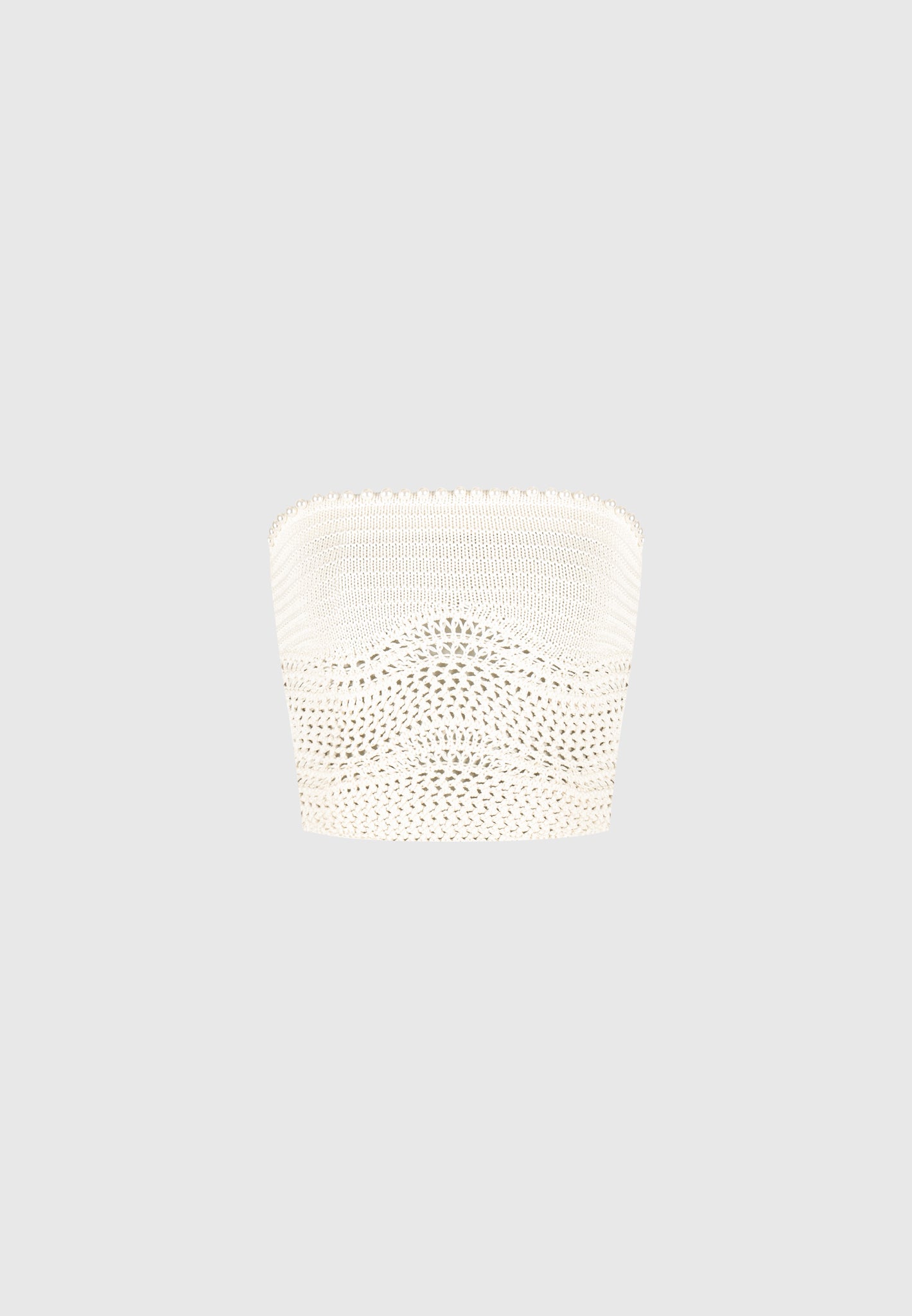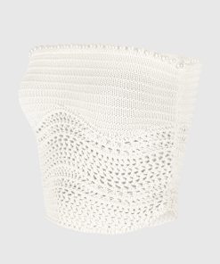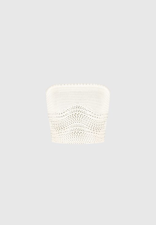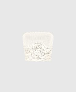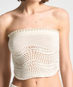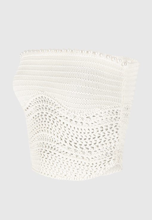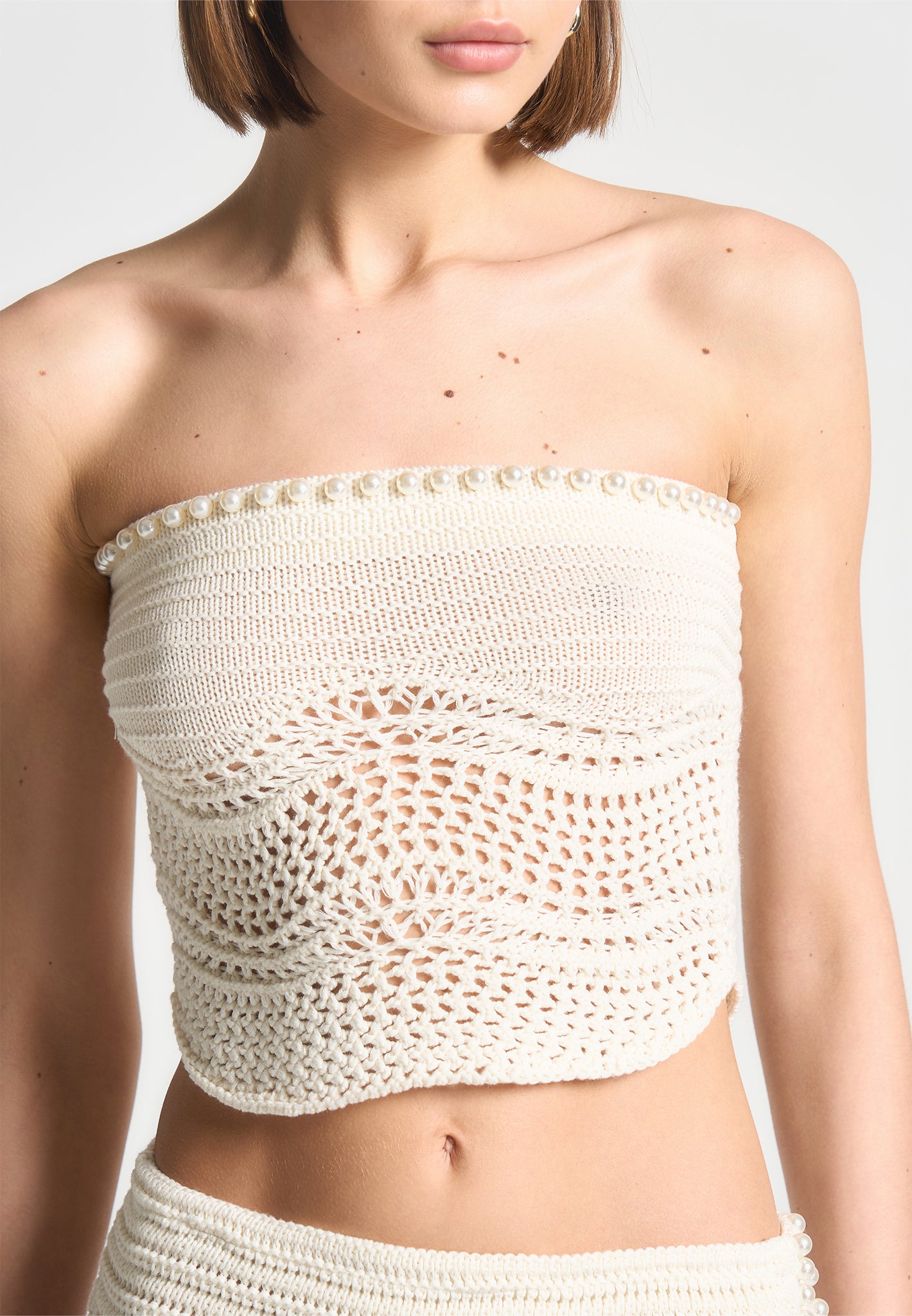 Expertly crafted with a soft knit and elasticated top edge, this Pearl Applique Crochet Bandeau Top is adorned with delicate pearl embellishments. Designed for comfort and style, this top is the perfect addition to any summer wardrobe.