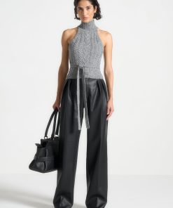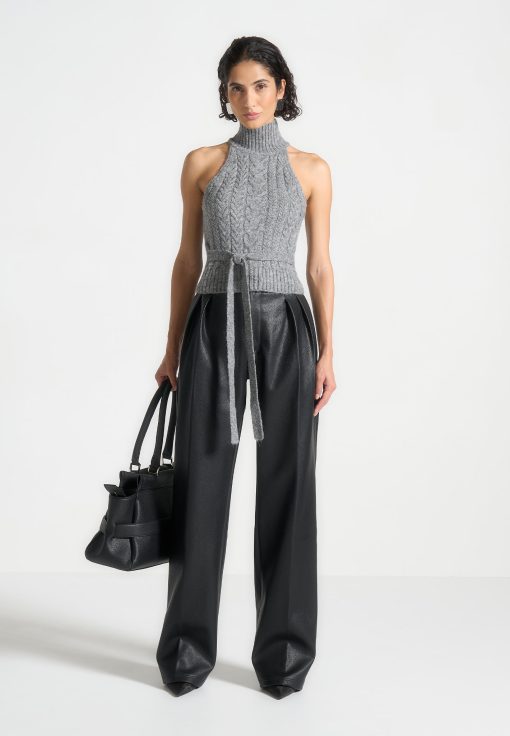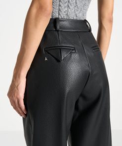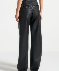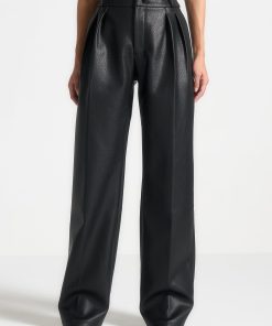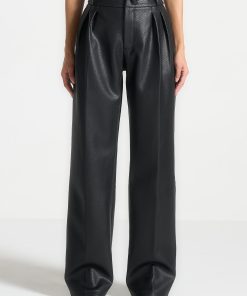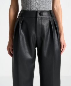 Expertly crafted from high-quality pebbled vegan leather, these trousers feature a flattering wide leg design with twin pleats for a chic and stylish look. The stacked design adds an extra touch of sophistication. These trousers are perfect for any occasion, combining style and comfort.