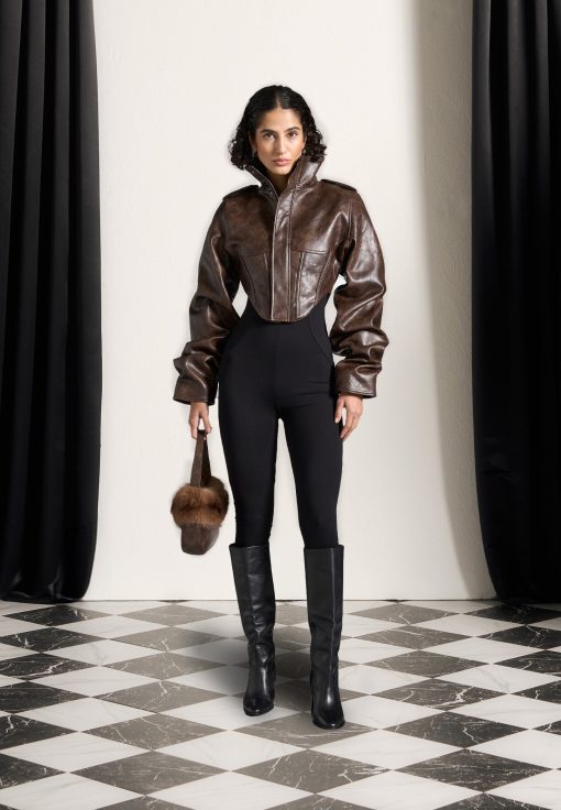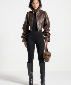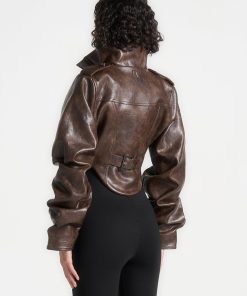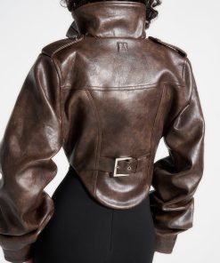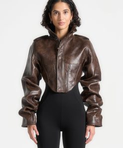 Crafted from luxurious vintage vegan leather, this brown jacket features intricate corset detailing and a high neck with tacked sleeves. Timeless in design, this jacket adds an elegant touch to any outfit. Made to last, it is a must-have for any fashion-forward wardrobe.