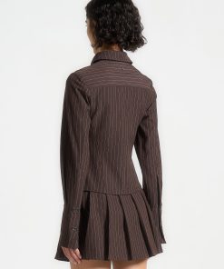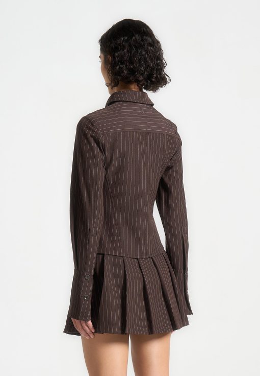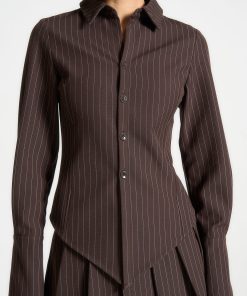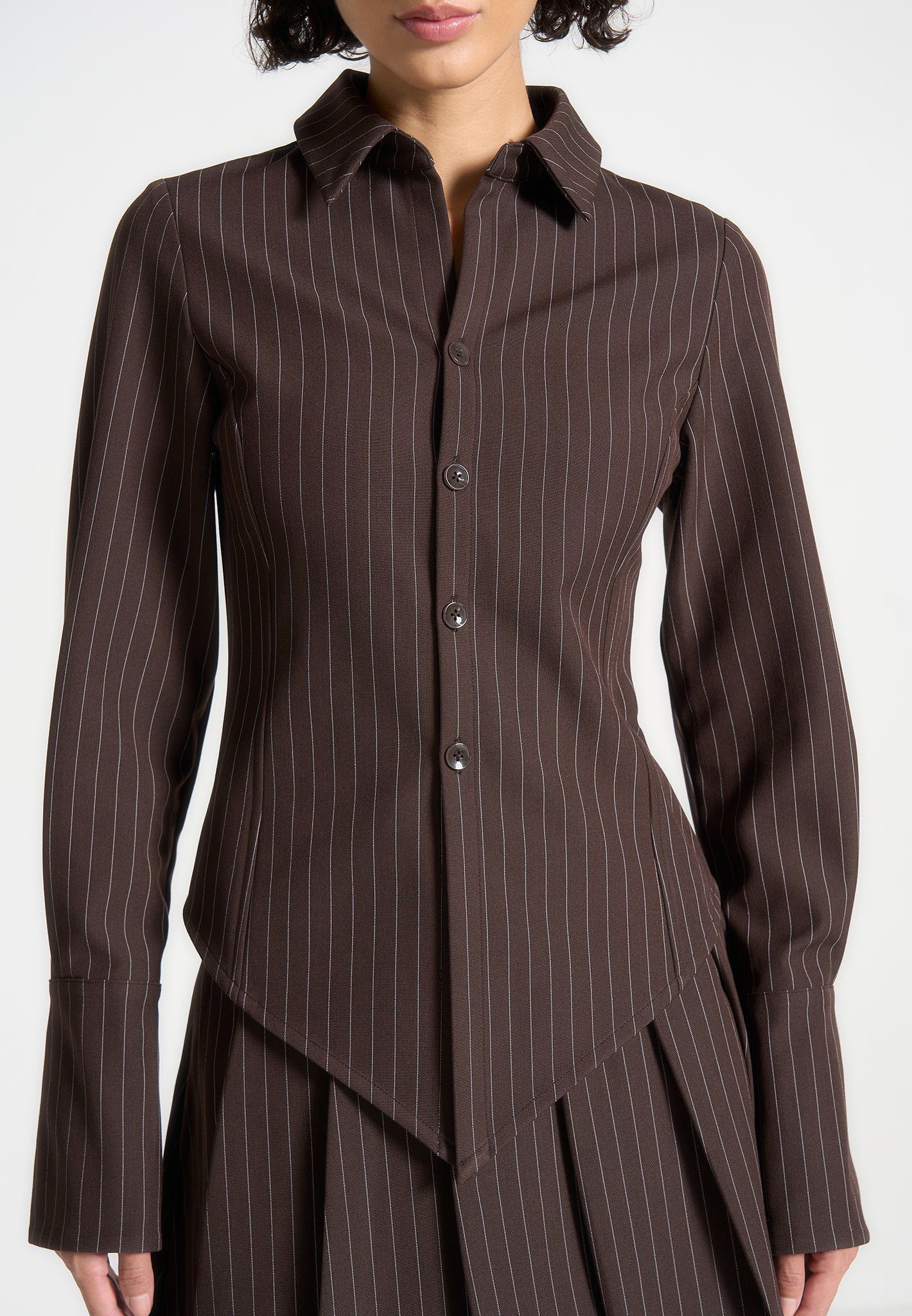 Expertly crafted with a modern angled hem, this pinstripe shirt effortlessly transitions from day to night. The deep cuffs add a touch of sophistication to this versatile piece. Add to your wardrobe with this must-have pinstripe shirt.