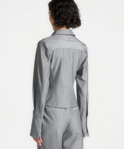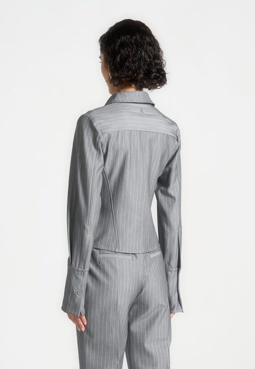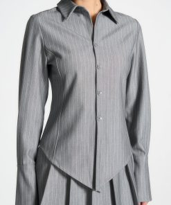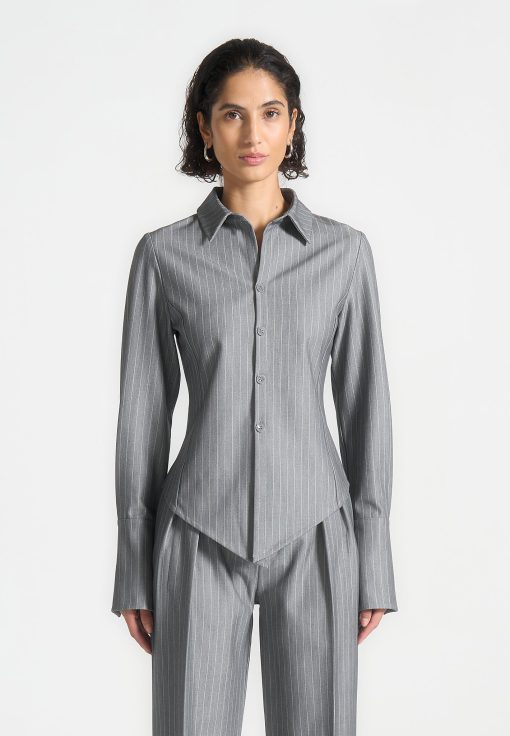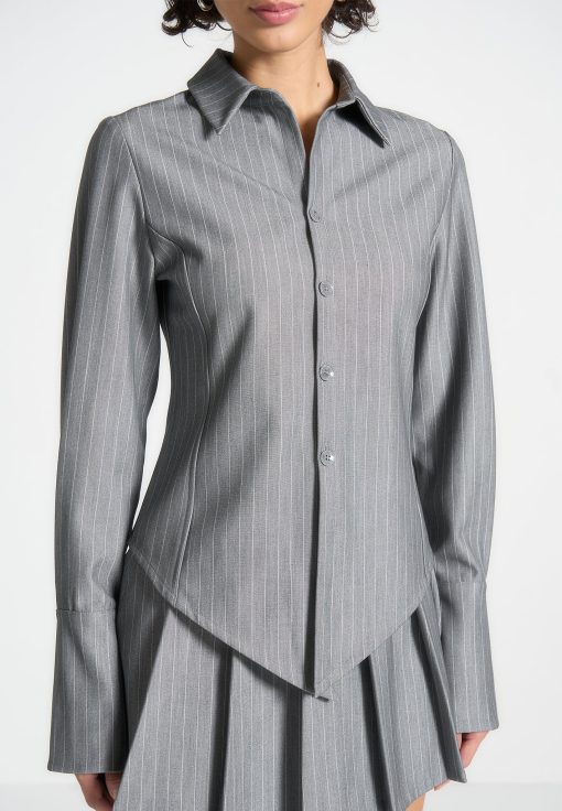 Expertly crafted with a modern angled hem, this pinstripe shirt effortlessly transitions from day to night. The deep cuffs add a touch of sophistication to this versatile piece. Add to your wardrobe with this must-have pinstripe shirt.