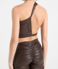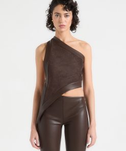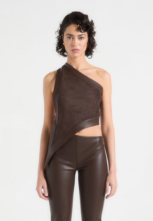 The Suede & Leather Asymmetric Backless Top in brown offers a striking, modern silhouette with adjustable straps for a custom fit. Expertly crafted from soft-touch vegan suede and leather, it combines luxury and comfort.