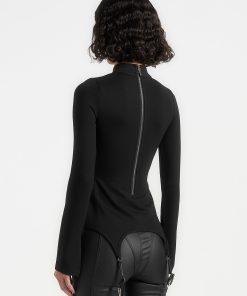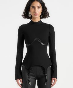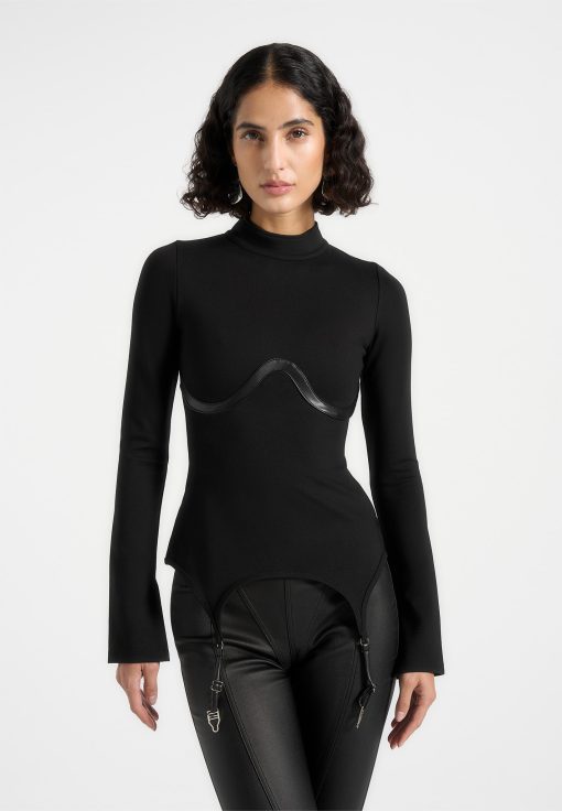 This black Suspender Detail Top features a unique suspender hem design and a flattering fit, making it a must-haveaddition to your wardrobe. The suspender hem adds a touch of edginess, while the flattering fit is designed toenhance your silhouette. Elevate your style with this versatile top.