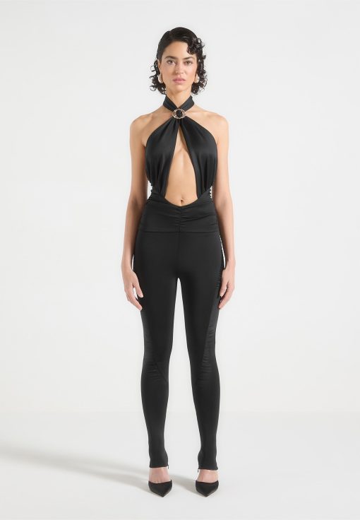 Make a bold statement with this sophisticated jumpsuit, featuring a halter neckline with a silver hammered adjuster and a refined front cutout. Designed with a ruched high waist and a tailored, figure-enhancing silhouette, this piece exudes elegance and modern glamour, perfect for upscale events and refined styling.