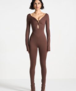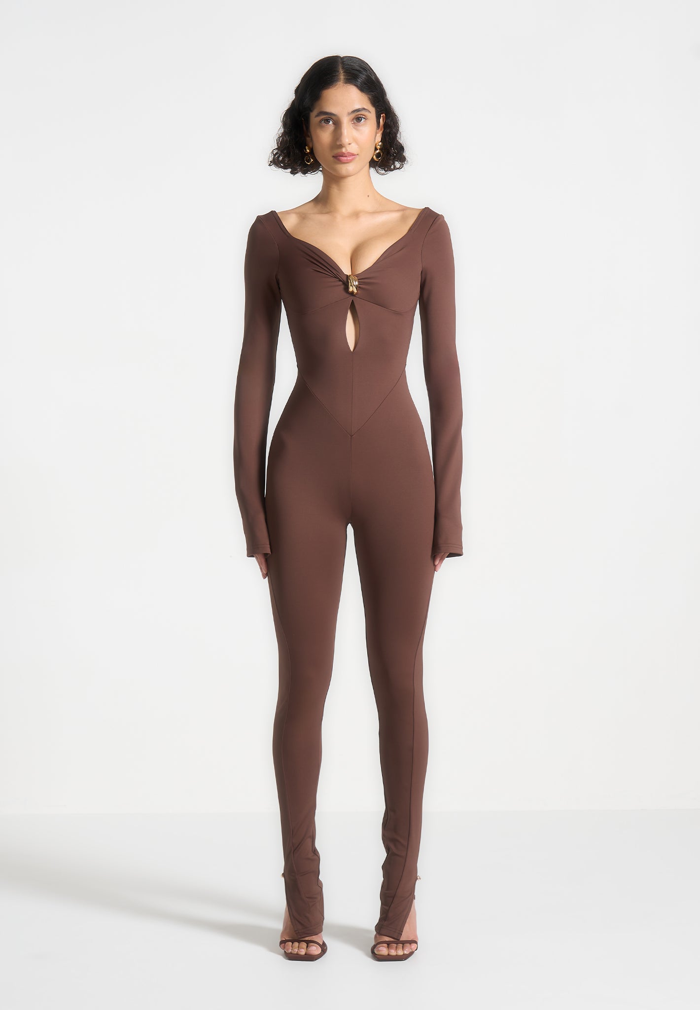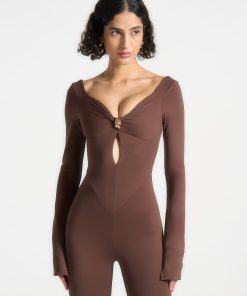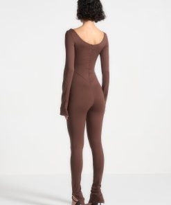 The long sleeve design and seam contour detailing provide a sleek silhouette, while the twist neckline adds a touch of elegance. This jumpsuit is designed to accentuate your figure.